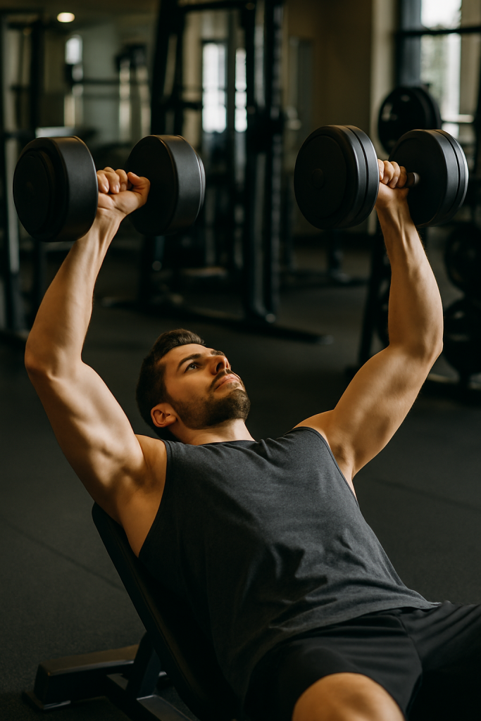 | 2. ضغط الكتف بالدمبل وقوفًا (Standing Dumbbell OHP) | الأكتاف الأمامية والجانبية | 3 | 6 – 8 | تمرين مركّب ثقيل – التركيز على الثبات |
