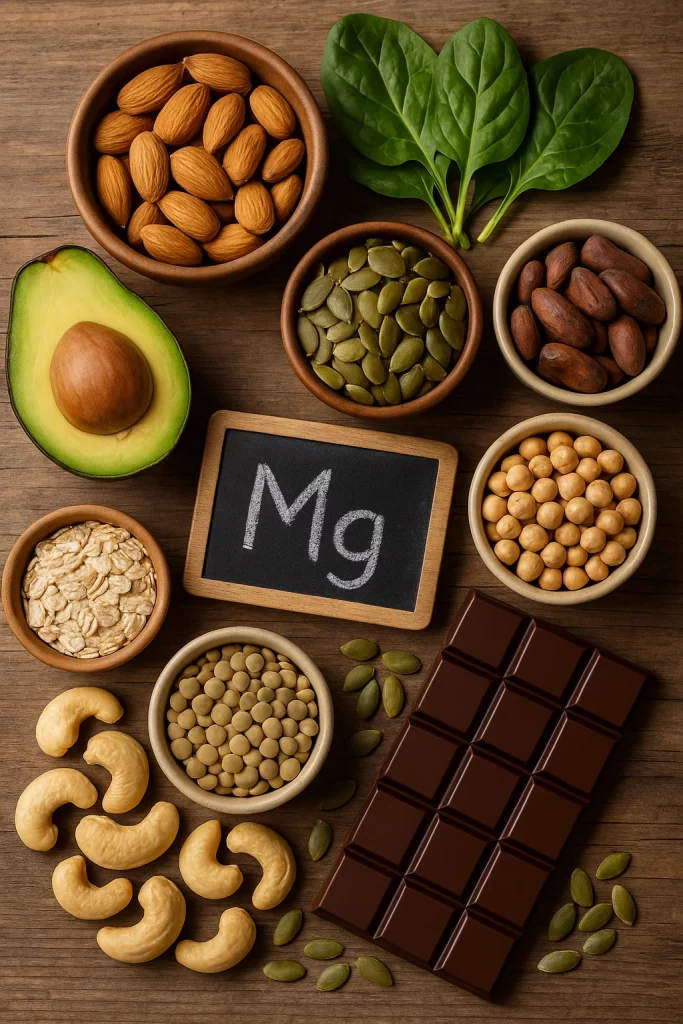 اللوز، بذور اليقطين، السبانخ، الأفوكادو، البقوليات، والشوكولاتة الداكنة تعد من أغنى المصادر الطبيعية للمغنيسيوم.